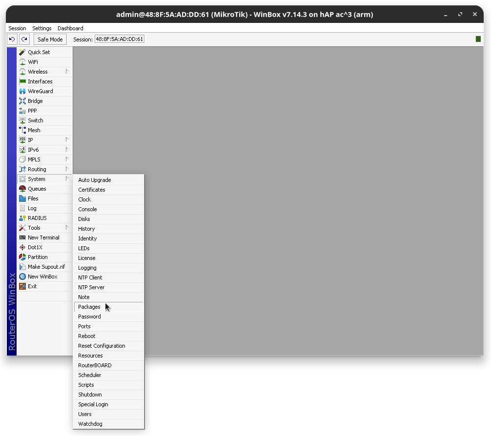 Para atualizar o RouterOS, abra o WinBox e vá em System > Packages: