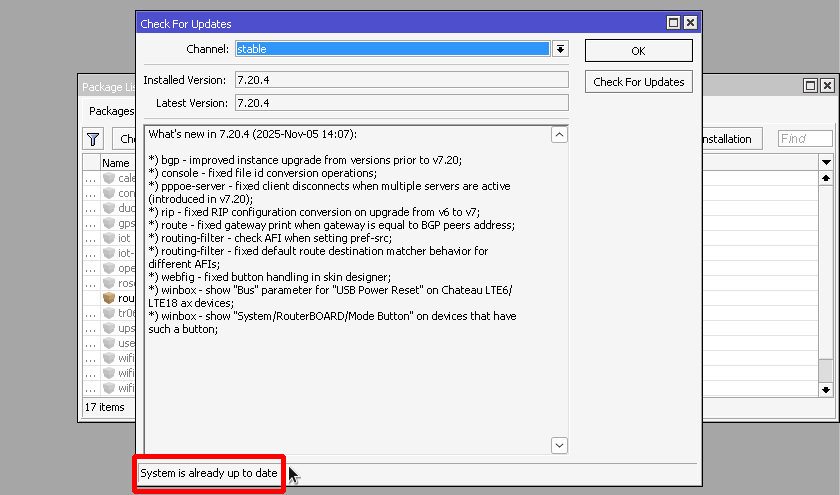 Feito isso, o MikroTik baixa e instala a atualização e se reinicia. Enquanto isso, o WinBox será desconectado. Quando o MikroTik terminar de reiniciar, o WinBox será reconectado e a janela Check For Updates passará a exibir System is already up to date: