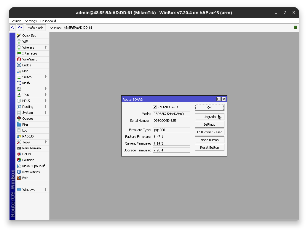 Para referência futura, estou usando a versão legada do WinBox (v3.43), baixada do site da MikroTik (a mais nova ainda é beta), o roteador MikroTik hAP ac³ e o novo Linux Kamarada baseado no Manjaro, mas o WinBox é feito para Windows e funciona igualmente bem nele. Também deve ser possível realizar essas atualizações pela interface web do MikroTik, os caminhos e telas são parecidos.