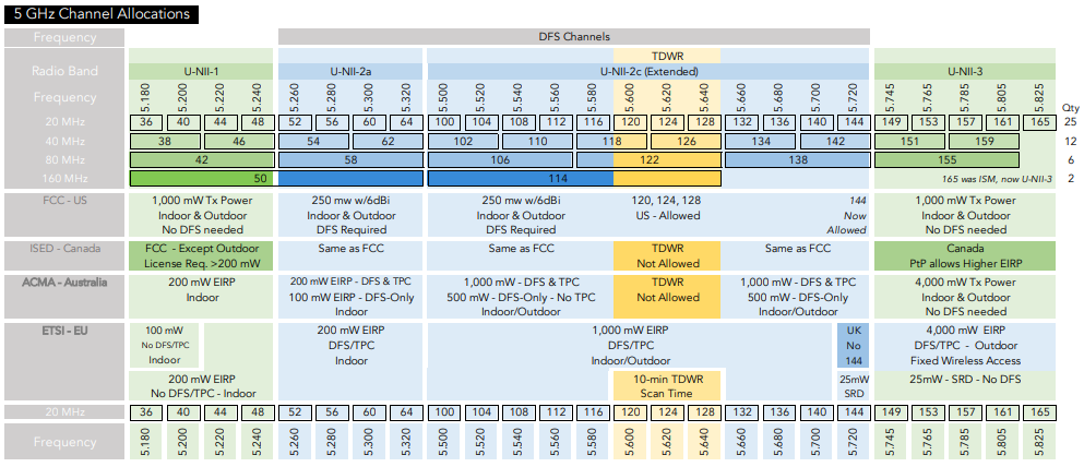 Nessa faixa, devemos nos atentar aos canais com restrições, que são os canais DFS (Dynamic Frequency Selection, seleção dinâmica de frequência, em inglês). Esses são canais que compartilham a mesma faixa de frequência usada por radares, como os meteorológicos e aeronáuticos. Para evitar interferir nesses sistemas críticos, os roteadores que usam canais DFS são obrigados a monitorar constantemente a presença de sinais de radar e, se detectarem algum, trocar automaticamente de canal. Esses canais costumam ser menos congestionados e podem oferecer melhor desempenho, mas podem causar trocas inesperadas de canal e pequenas interrupções quando essas trocas acontecem.