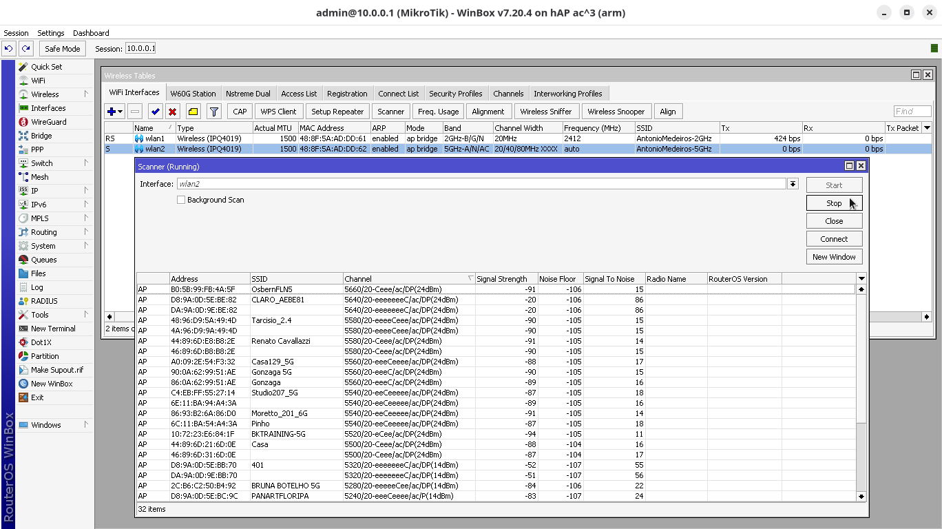 Ao que parece, ninguém na vizinhança usa frequências mais altas, acima de 5660 MHz. Na faixa de 5 GHz, meu MikroTik é capaz de ir até 5820 MHz.