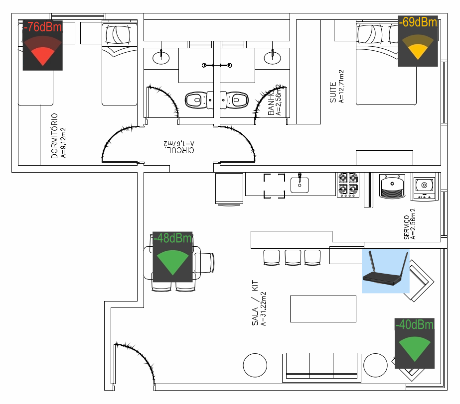 Aqui está o nível de sinal da rede AntonioMedeiros-5GHz reportado pelo aplicativo WiFiAnalyzer em cada cômodo do apartamento depois dos ajustes (infelizmente, não tenho como comparar com a situação anterior, porque, como disse, a rede Wi-Fi não aparecia para mim na configuração padrão do MikroTik):