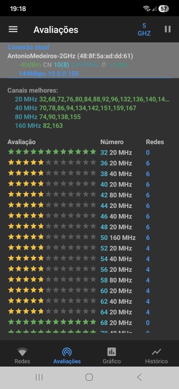Assim como fizemos na parte 1 com a faixa de 2,4 GHz, vamos analisar a faixa de 5 GHz usando o aplicativo WiFiAnalyzer (lembrando que nas abas Gráfico e Avaliações devemos mudar para a faixa de 5 GHz, há uma opção para fazer essa mudança na parte superior da tela):
